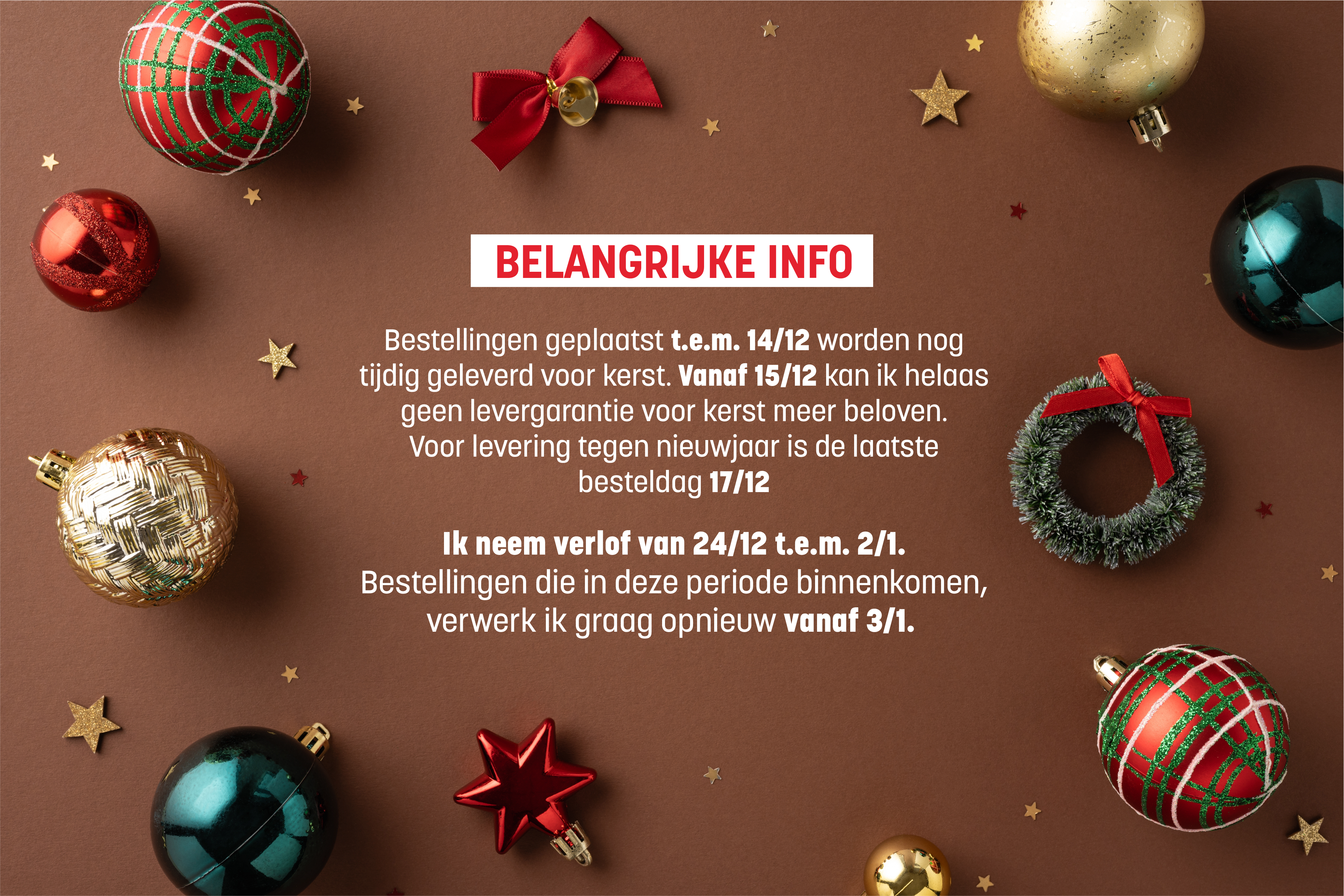 DEADLINE KERST — Bestellen kan tot ten laatste 14/12 voor gegarandeerde levering voor kerst.