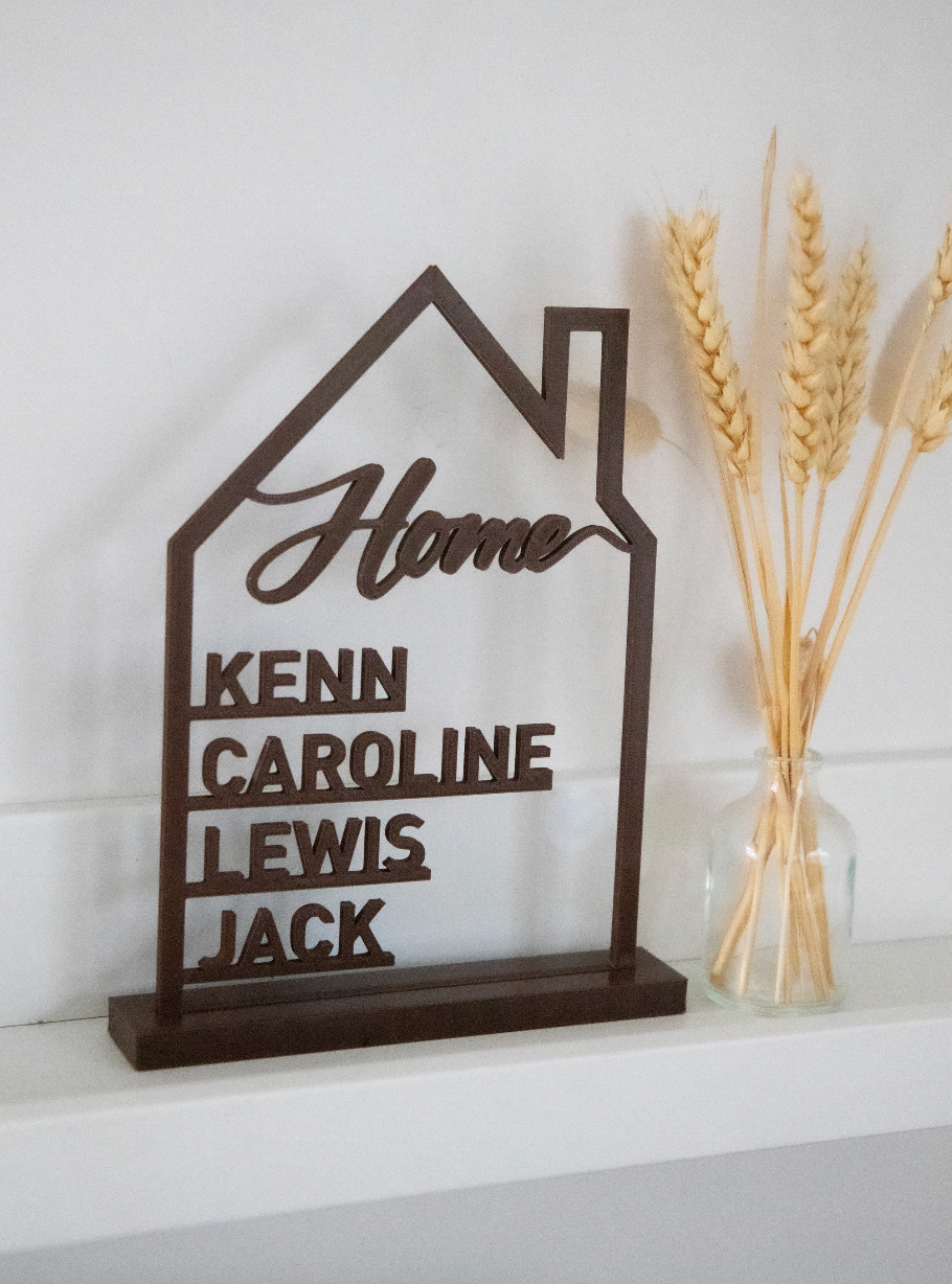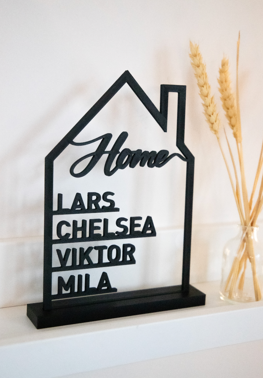 Breng warmte en persoonlijkheid in je interieur met deze stijlvolle 3D-geprinte Home-decoratie. Gemaakt in de vorm van een huis, met het sierlijke woord Home bovenaan en de namen van je gezinsleden eronder — een uniek symbool van verbondenheid en liefde.