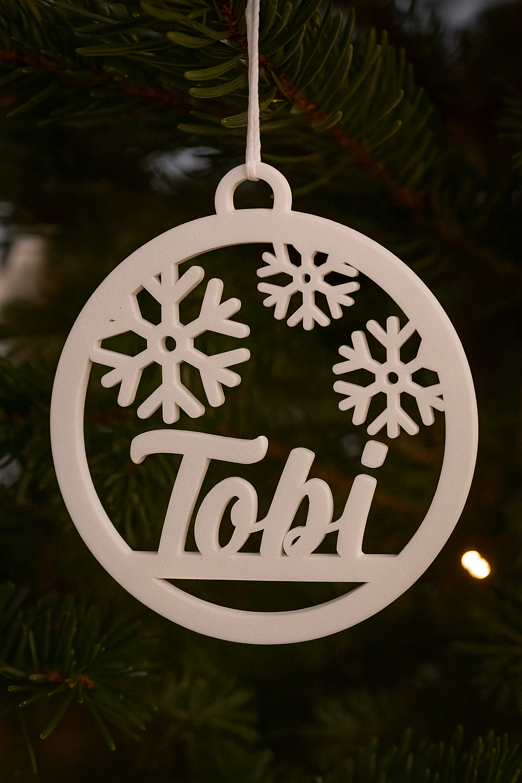 Breng een unieke en moderne touch aan je kerstboom met deze stijlvolle, gepersonaliseerde kersthanger! Deze hanger is zorgvuldig 3D-geprint in hoogwaardig wit materiaal met een dikte van 4 mm, wat zorgt voor een strak en elegant uiterlijk.