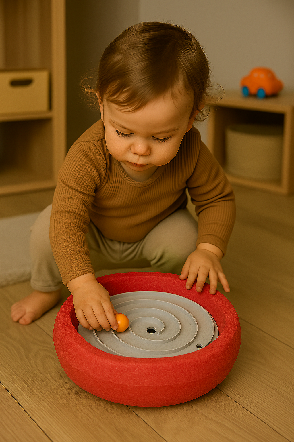 Deze uniek ontworpen insert is 3D-geprint en heeft een prachtig spiraalvormig reliëf waarin een balletje kan rollen. Perfect voor kleine handjes en nieuwsgierige ontdekkers die willen oefenen met beweging, coördinatie en concentratie.
